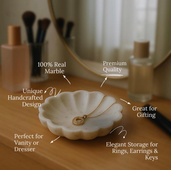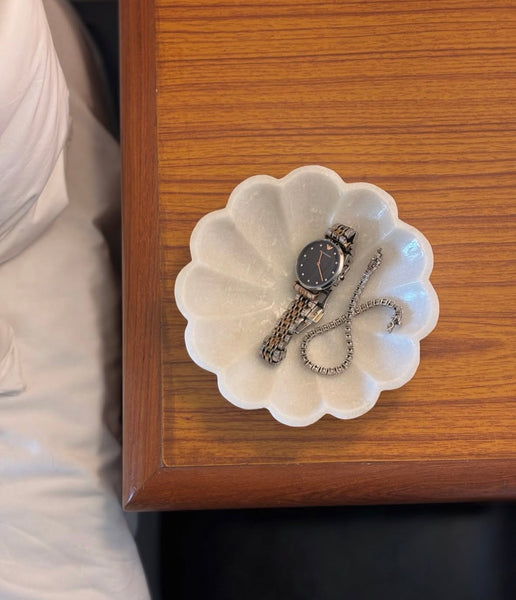 This is our Scallop Marble Bowl, made from white marble. It's perfect if you're looking to add a nice touch to your home. You can use it for decorating your room, placing it on a shelf, or even gifting it to someone special. The natural white marble gives it a rich and classy look. It's useful, beautiful, and made with care.