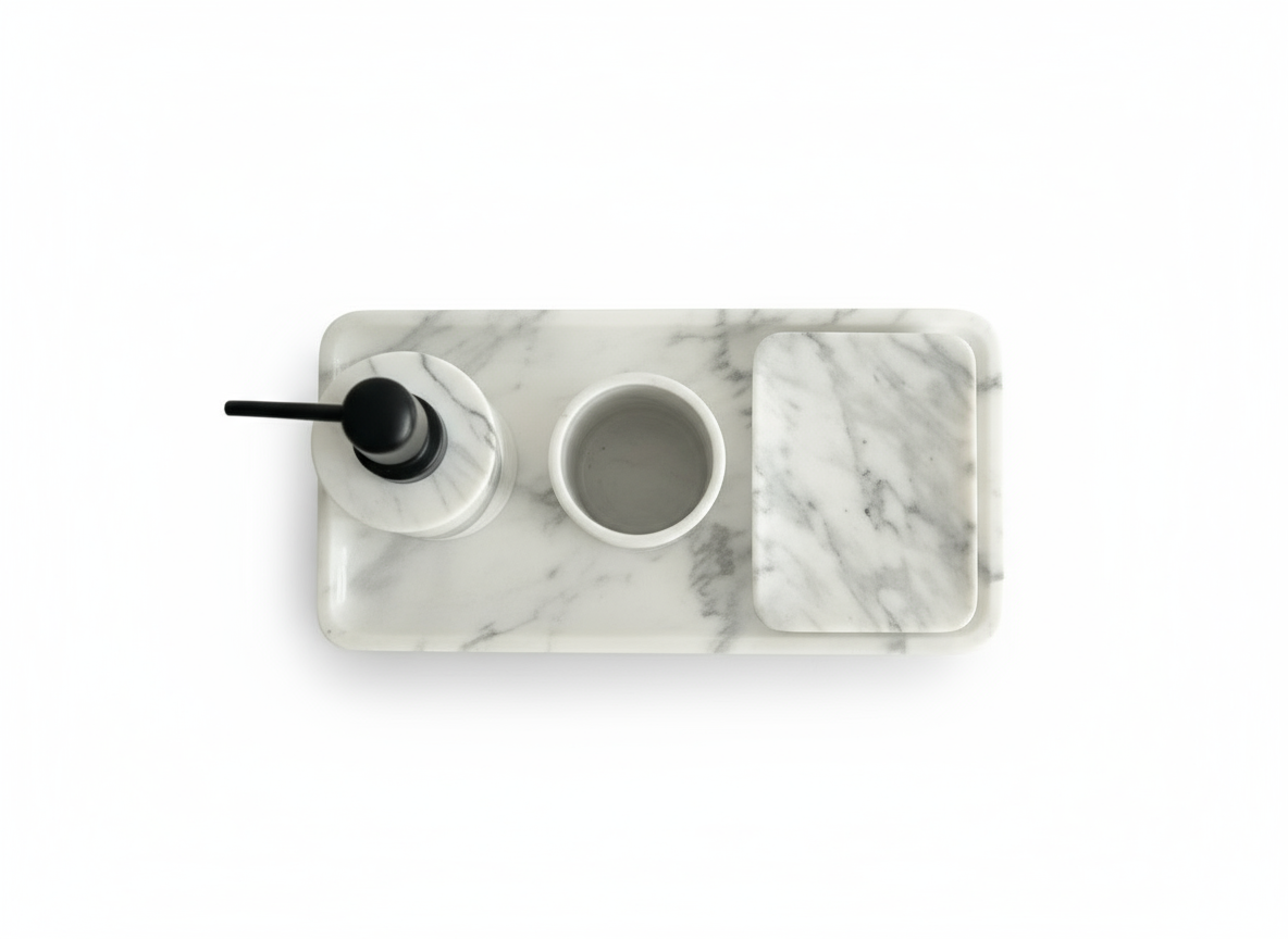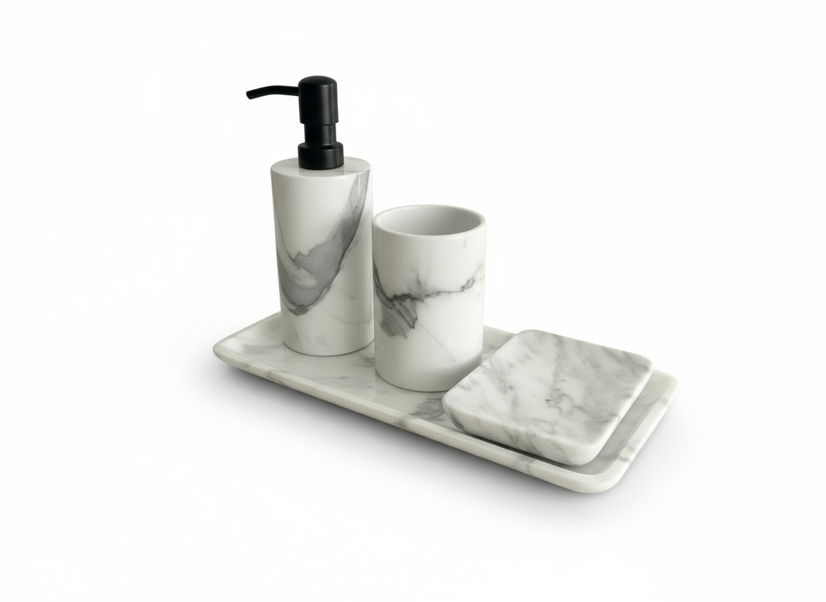 BR & Sons’ luxury Statuario Marble Bathroom Set is designed to bring five-star hotel elegance into your everyday routine. Crafted by skilled Indian artisans using premium Statuario marble imported from Italy, this coordinated 4-piece set instantly elevates any vanity or bathroom counter. The crisp white stone with its soft grey veining creates a timeless, minimalist look that works beautifully in both modern and classic interiors.