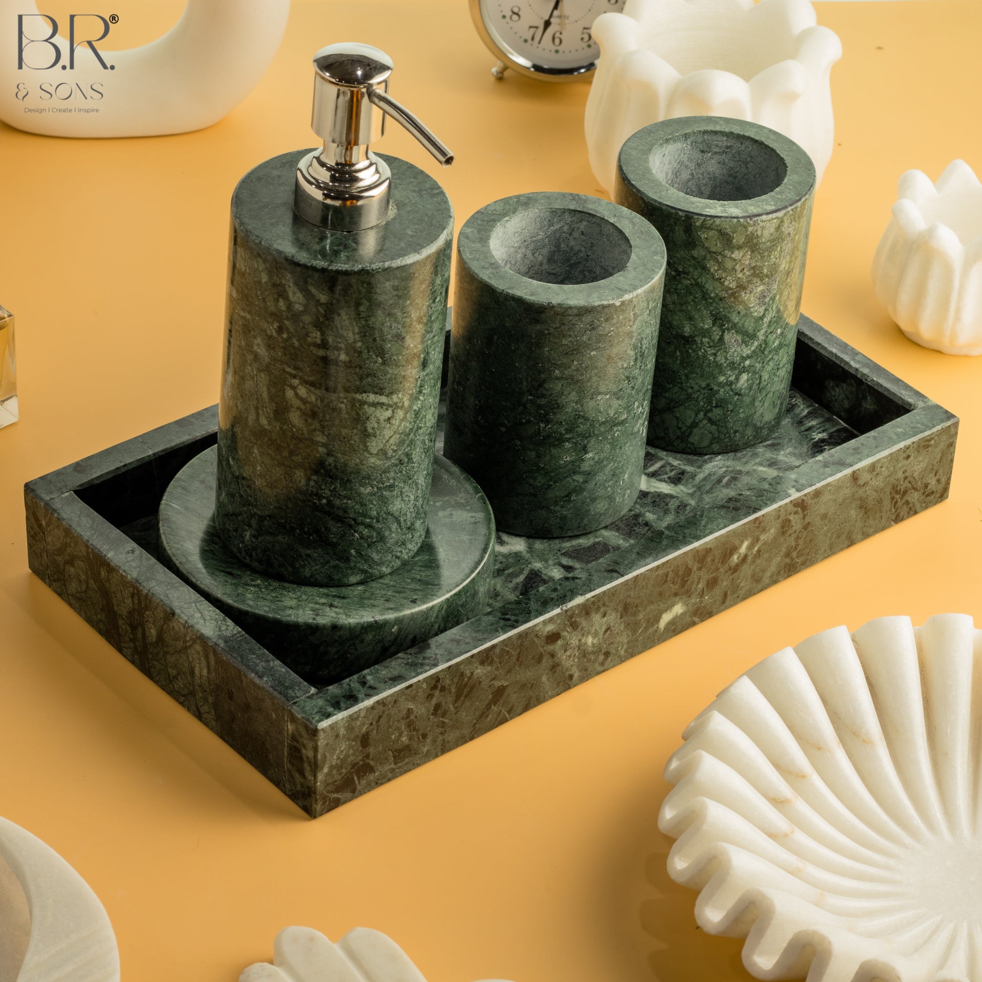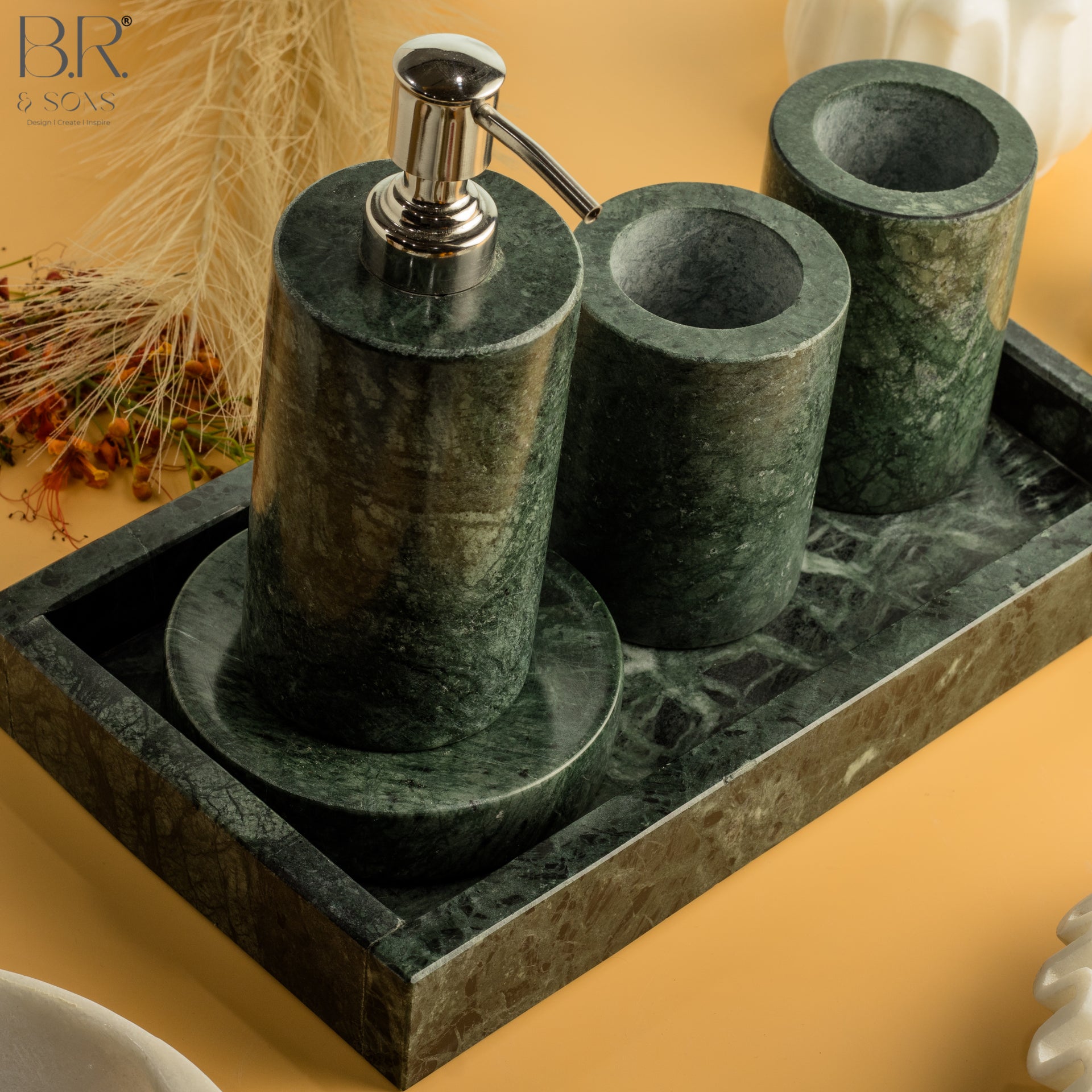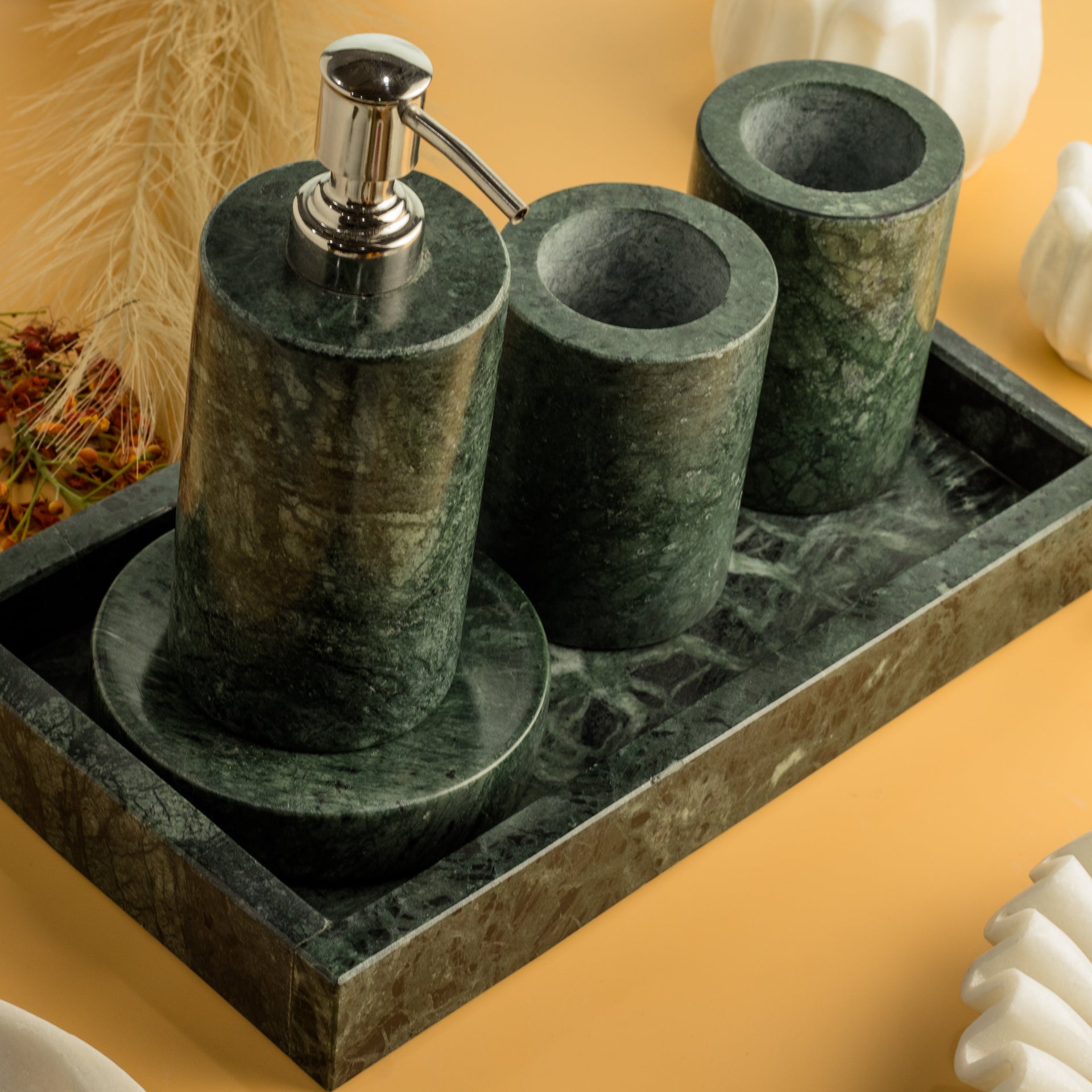 This is our Green Bathroom Set, made from Green Marble. It's perfect if you're looking to add a nice touch to your home. You can use it for decorating your room, placing it on a shelf, or even gifting it to someone special. The natural Green Marble gives it a rich and classy look. It's useful, beautiful, and made with care.