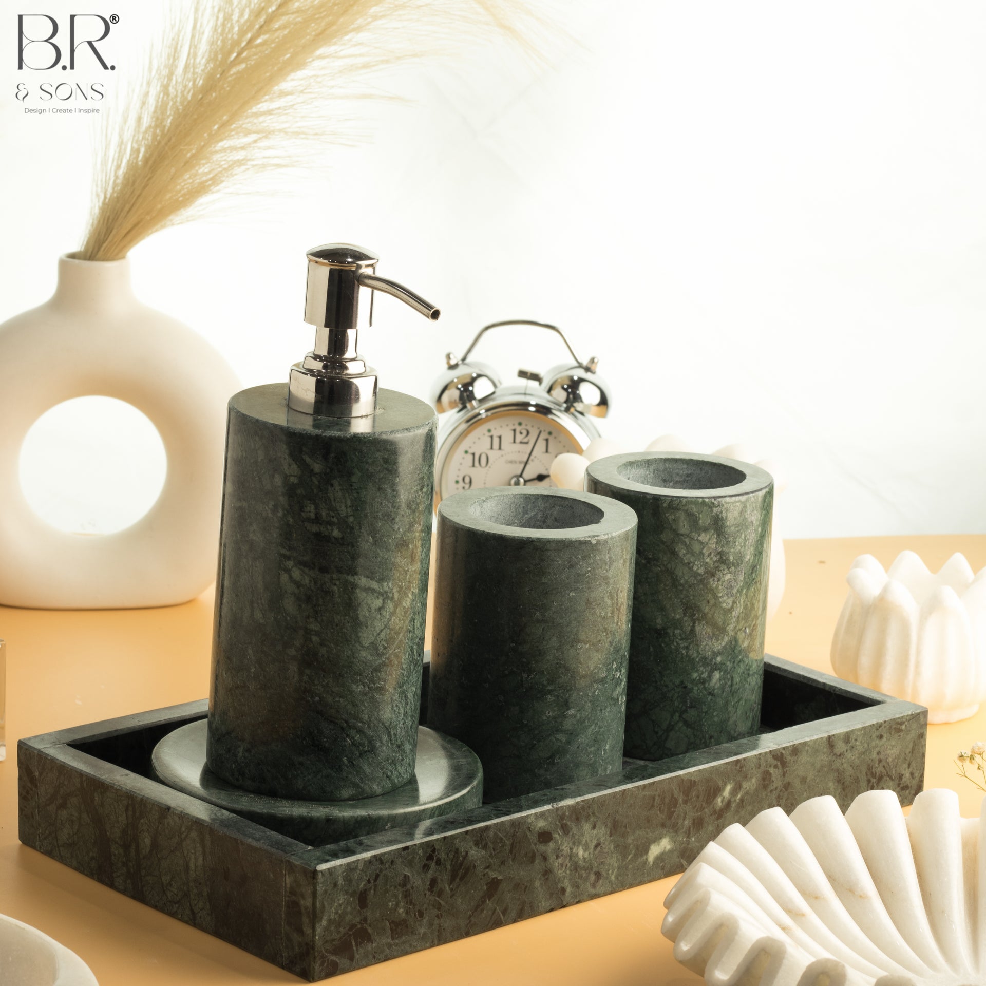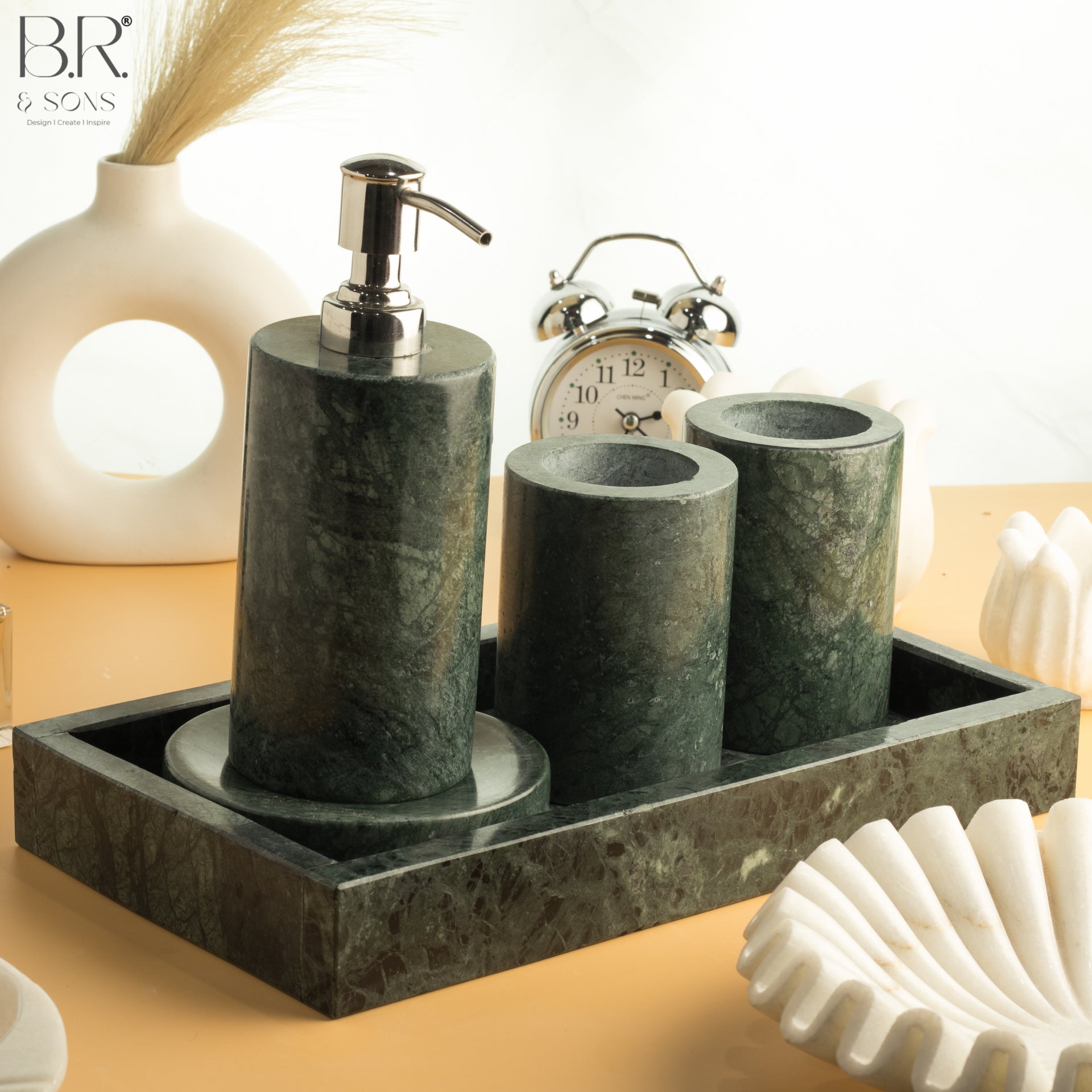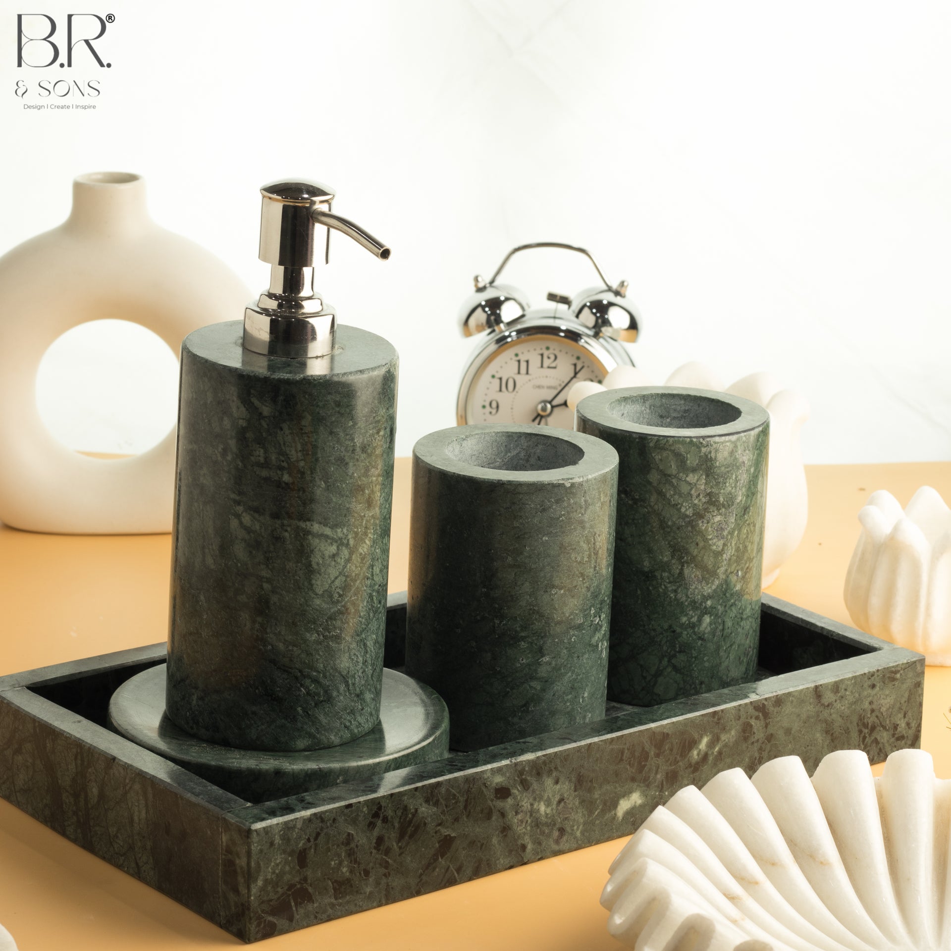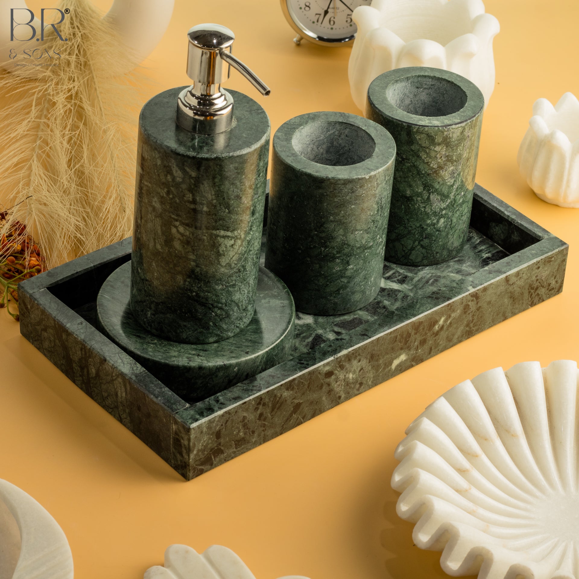 This is our Green Bathroom Set, made from Green Marble. It's perfect if you're looking to add a nice touch to your home. You can use it for decorating your room, placing it on a shelf, or even gifting it to someone special. The natural Green Marble gives it a rich and classy look. It's useful, beautiful, and made with care.