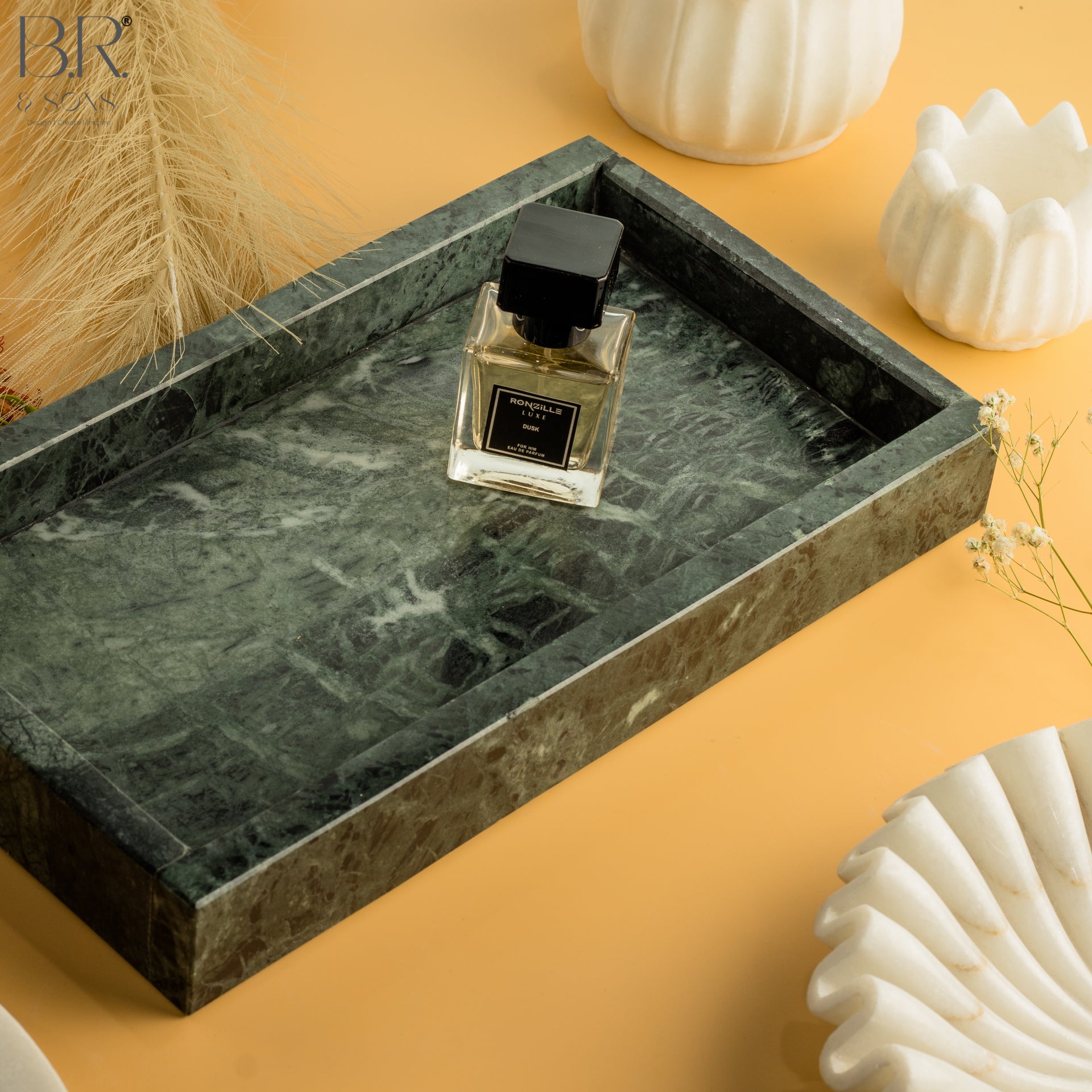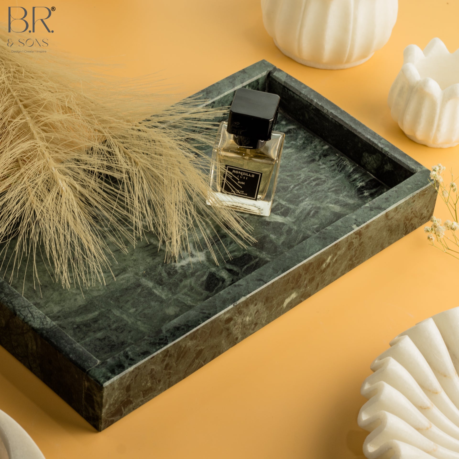 This is our Green Square Bathroom Organizer Tray, made from Green Marble. It's perfect if you're looking to add a nice touch to your home. You can use it for decorating your room, placing it on a shelf, or even gifting it to someone special. The natural Green Marble gives it a rich and classy look. It's useful, beautiful, and made with care.