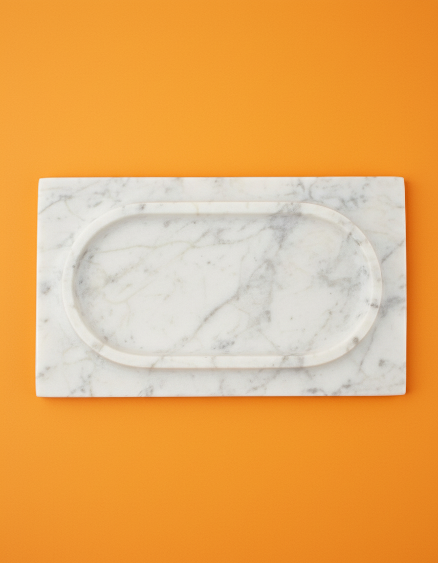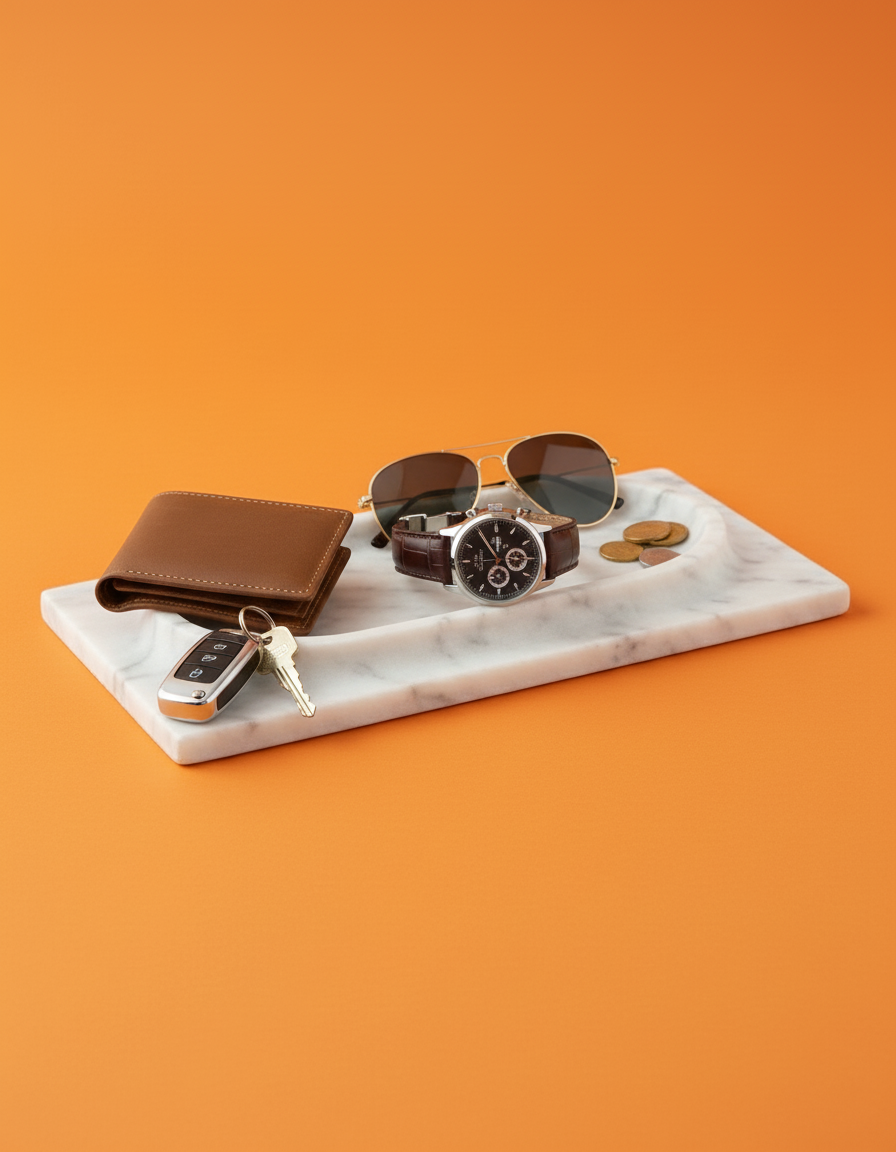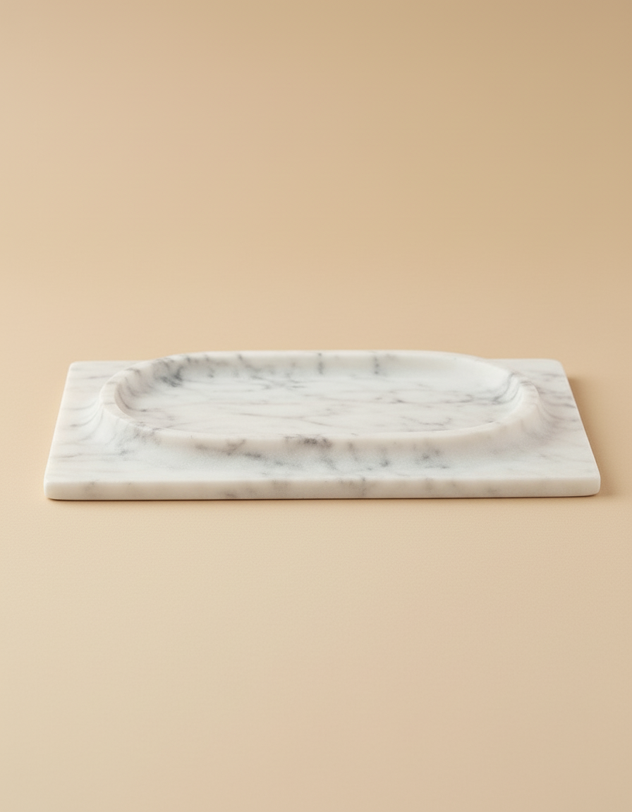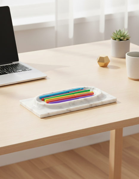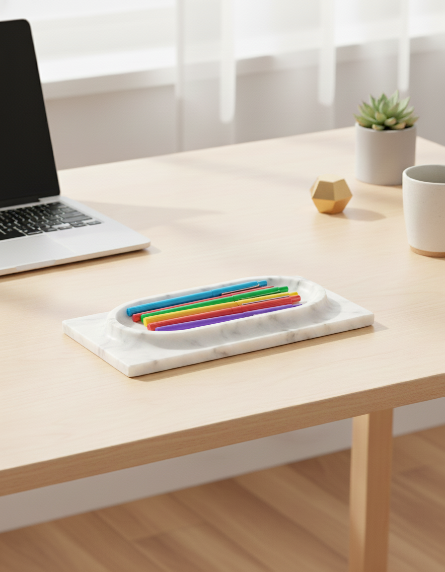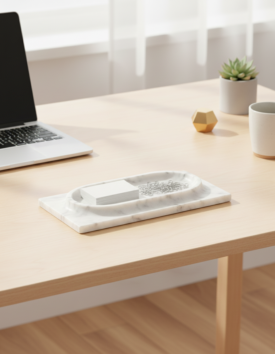The LUMO VALET TRAY represents a sophisticated approach to desktop organization, crafted from premium natural marble with meticulous attention to detail. This 10x5 inch piece transcends typical catchall trays by combining genuine stone craftsmanship with thoughtful design proportions that accommodate daily essentials—keys, wallets, pens, and accessories—without visual clutter. Each tray showcases the inherent character of natural marble, with subtle veining and soft surface finishes that elevate any workspace or entryway. The curated color palette ensures seamless integration with contemporary and classic interiors alike. Beyond its organizational function, the LUMO TRAY serves as a refined decorative element that reflects an appreciation for quality materials and understated luxury. Its compact yet functional dimensions make it ideal for desks, nightstands, console tables, and entryways where both utility and aesthetic refinement are valued.