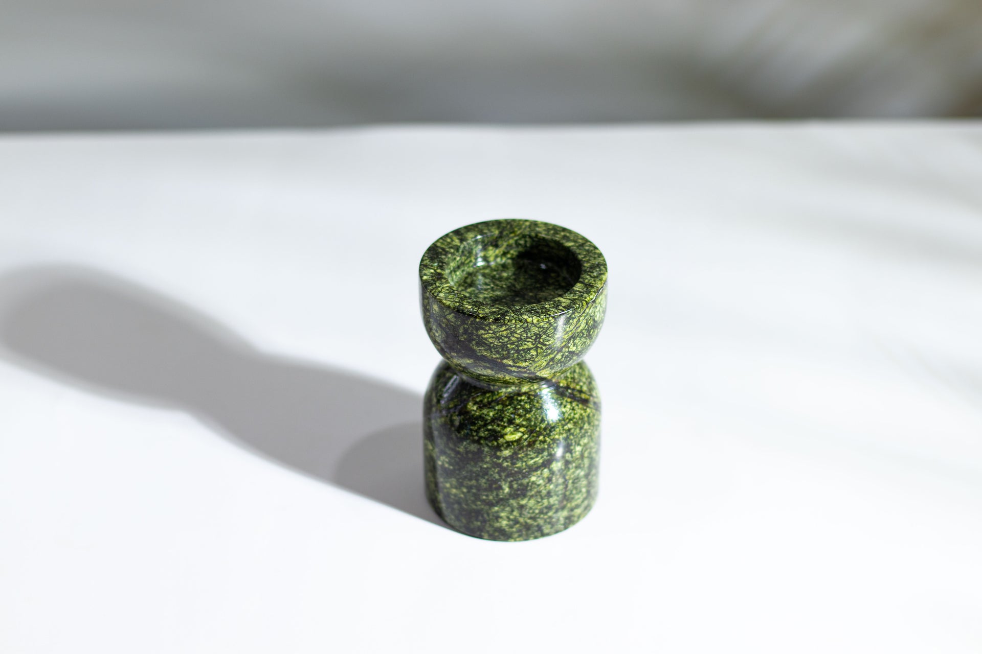 Artfully crafted from Indian Rainforest Green Marble, this candle holder exudes sophistication and luxury. With outstanding precision, it showcases the beauty and elegance of natural stone. Bring a touch of nature into your home while enjoying a warm and inviting candlelit ambiance.
