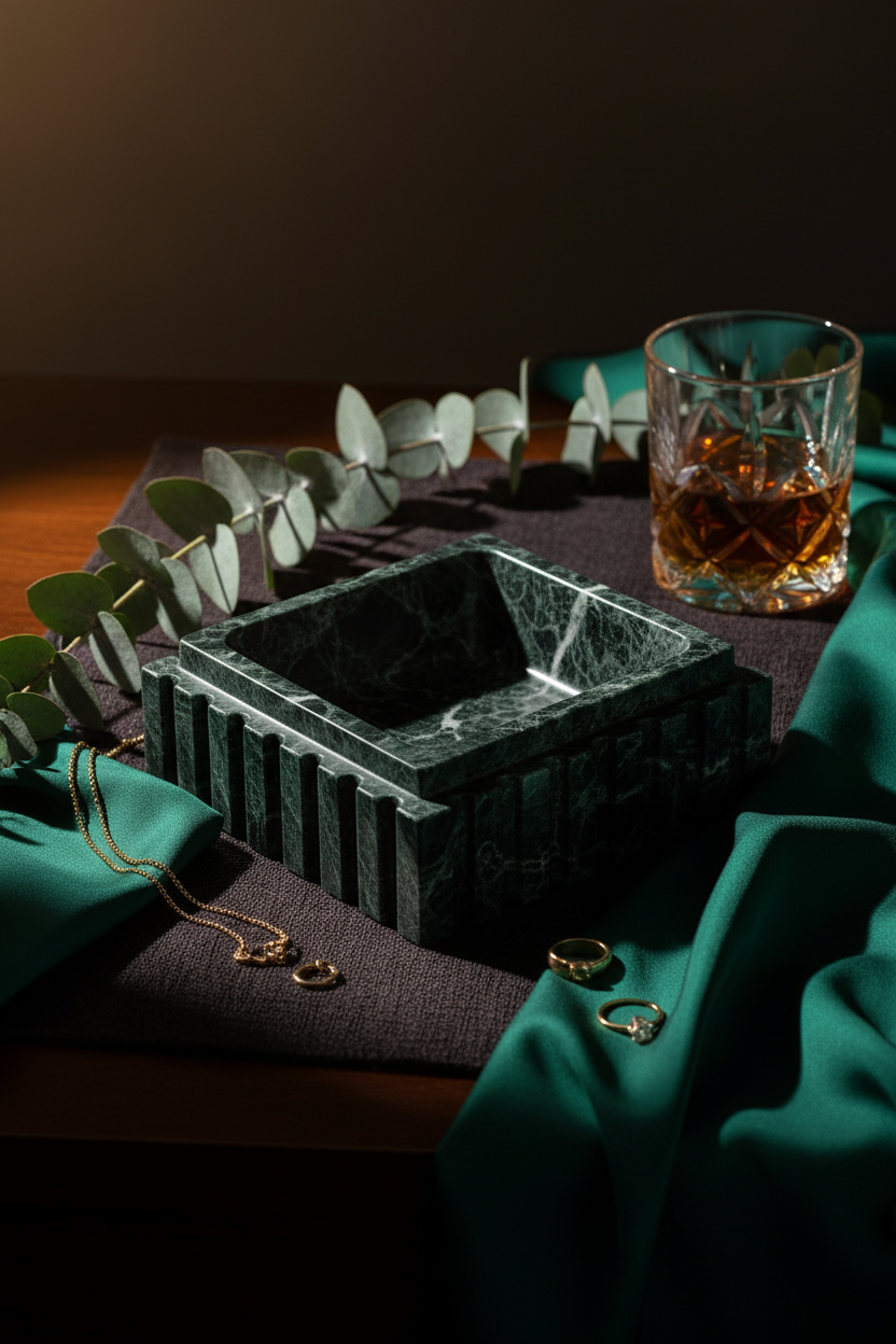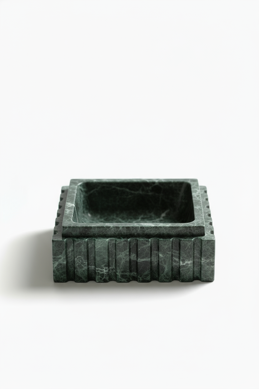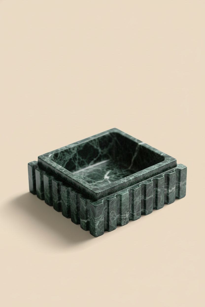 This artisanal valet tray is crafted from premium green marble, featuring intricate natural veining and a bold geometric stepped edge design. Its square profile and refined finish make it a statement piece for any entryway console, bedside table, or office desk. Designed to beautifully organize your essentials, it blends luxurious aesthetics with practical functionality—a perfect spot for your keys, coins, wallet, or favorite jewelry. Each tray is hand-finished by skilled artisans, ensuring that the unique patterns of Indian marble are highlighted, adding an elegant accent to your home or workspace.