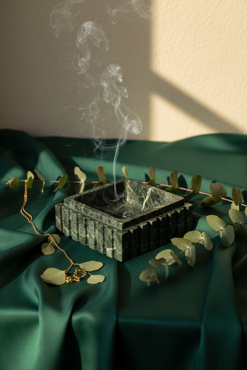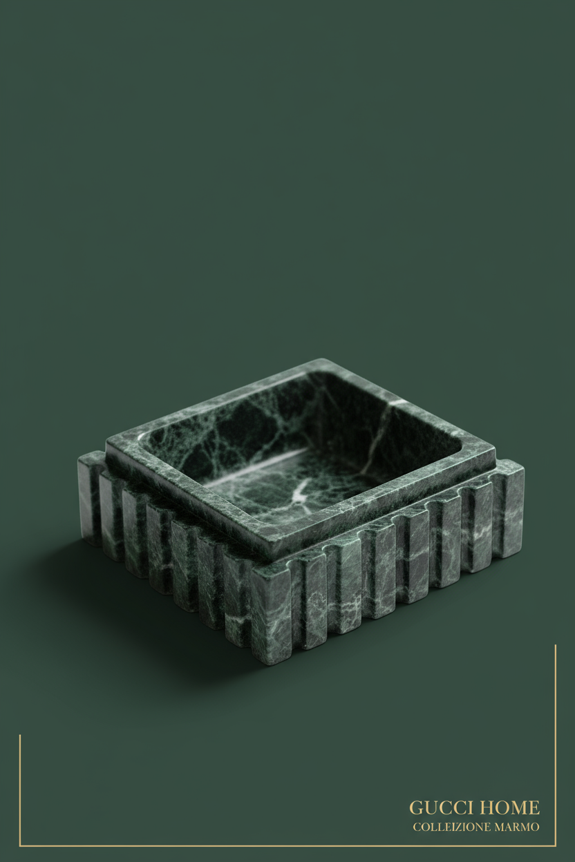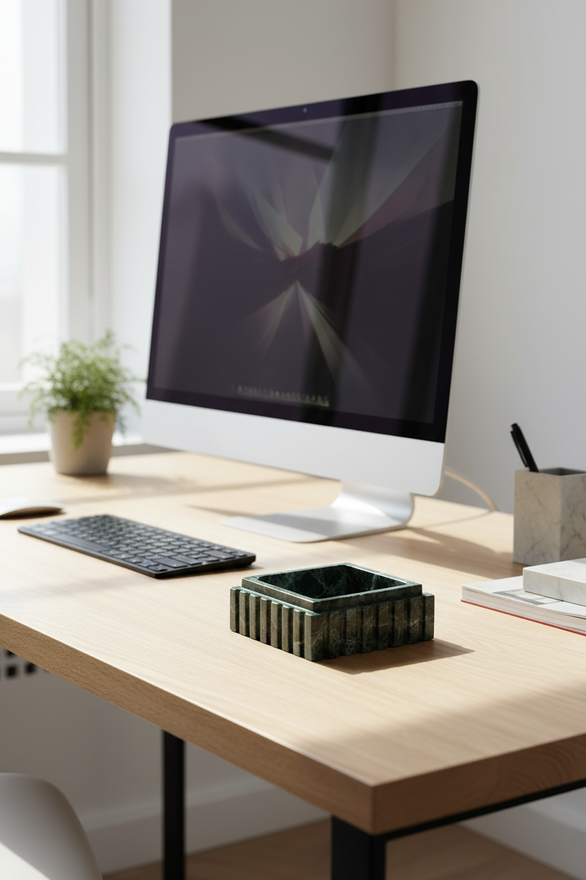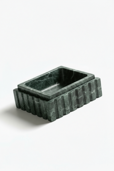 This artisanal valet tray is crafted from premium green marble, featuring intricate natural veining and a bold geometric stepped edge design. Its square profile and refined finish make it a statement piece for any entryway console, bedside table, or office desk. Designed to beautifully organize your essentials, it blends luxurious aesthetics with practical functionality—a perfect spot for your keys, coins, wallet, or favorite jewelry. Each tray is hand-finished by skilled artisans, ensuring that the unique patterns of Indian marble are highlighted, adding an elegant accent to your home or workspace.