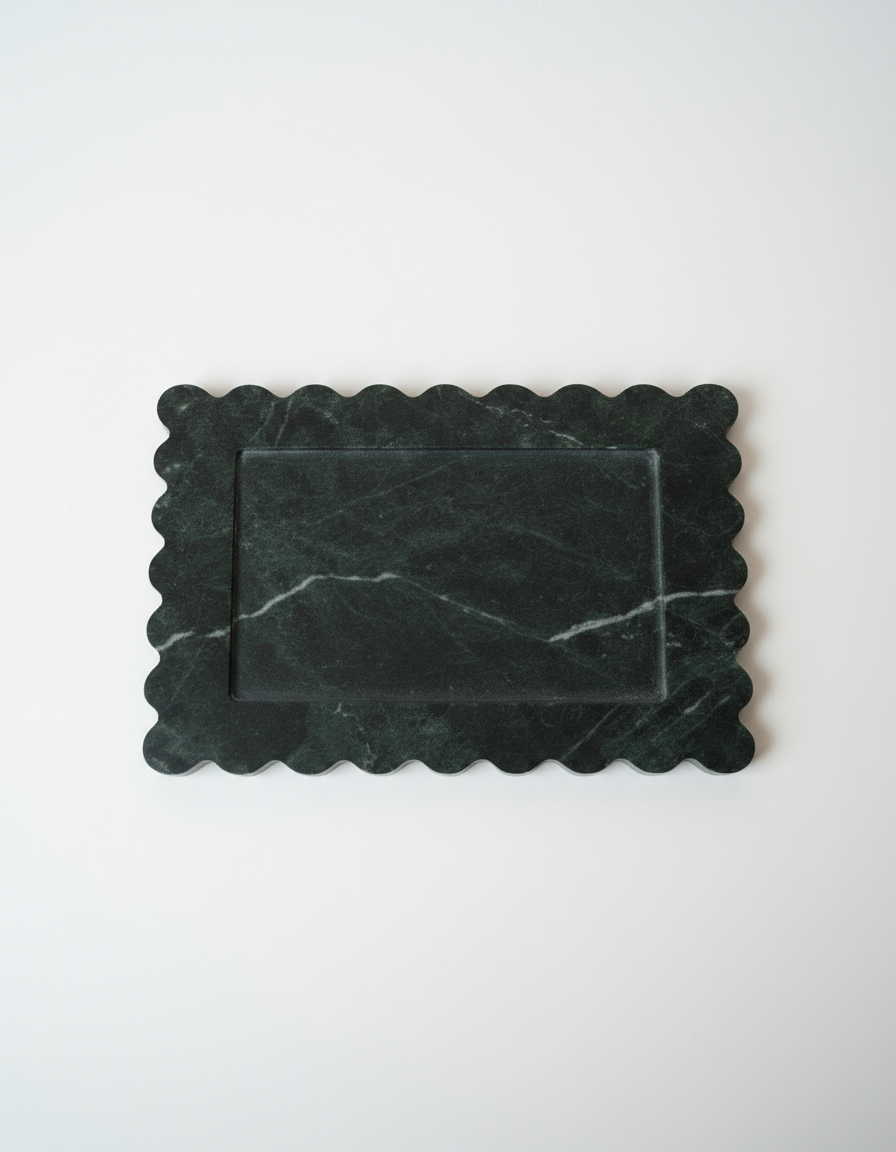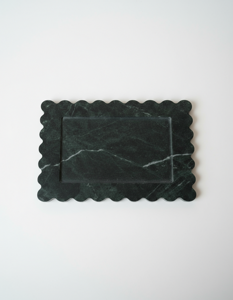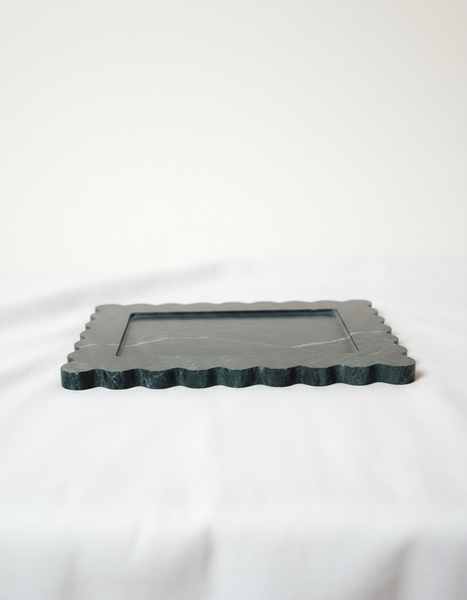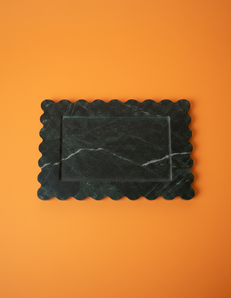 The Floral Tray 810 in Emerald is a fine art object by BR& Sons. Hand-sculpted in Rajasthan, India, the tray is cut from untouched dark green marble stone and hand polished. Featuring smooth, scalloped edges, these petit catch-alls add an elevated organic touch to any tableau or tablescape. Variations in color, polish, and pattern are reflections of the natural state of the stone and guarantee each piece is truly one of a kind. Anastasio Home was founded by Gabriela Anastasio Holloway and produces limited edition home accessories inspired by heirloom pieces, with a commitment to preserving and championing the livelihoods of global craftspeople.