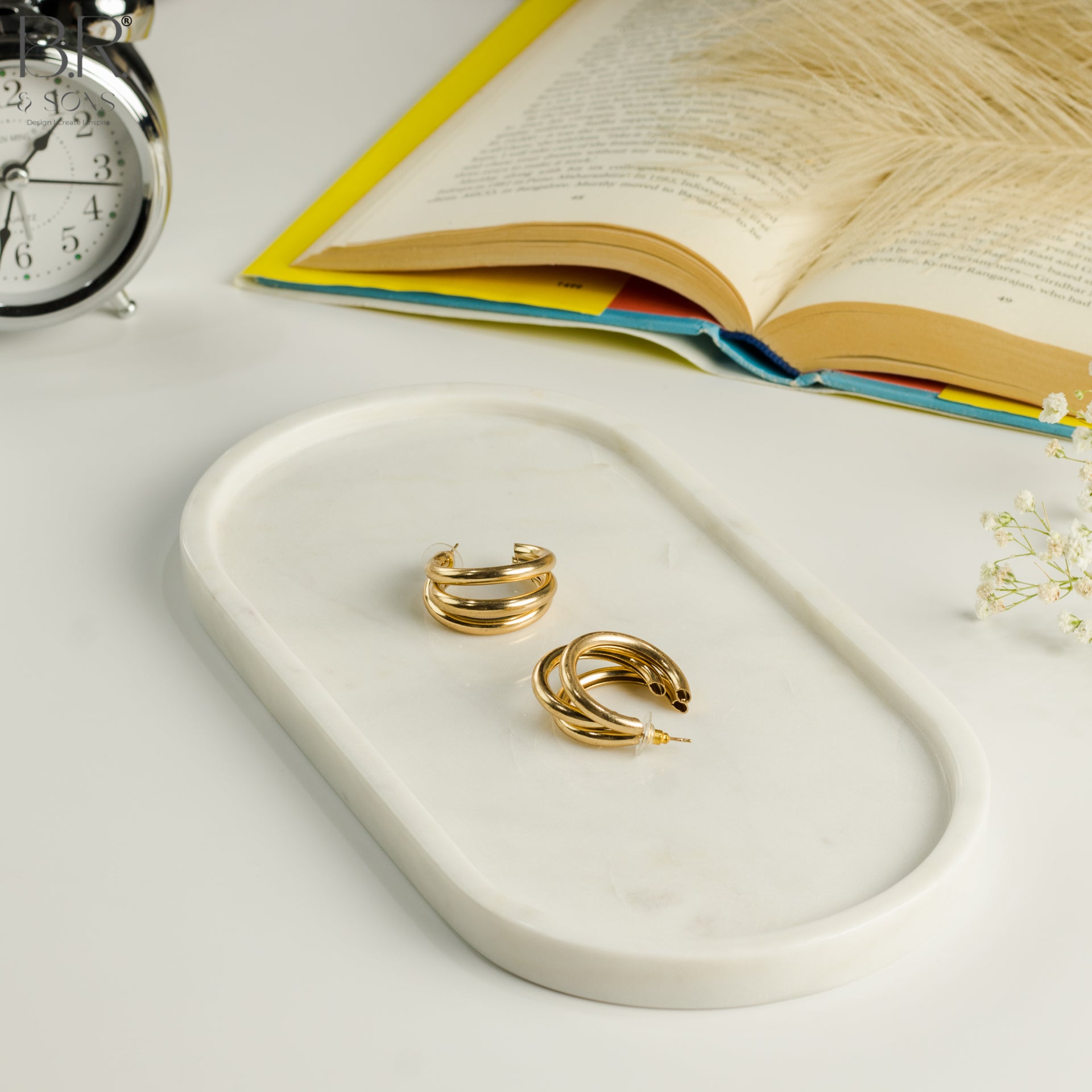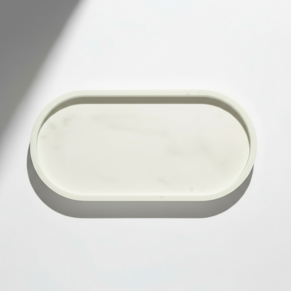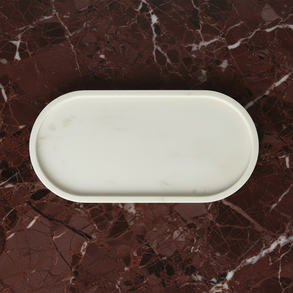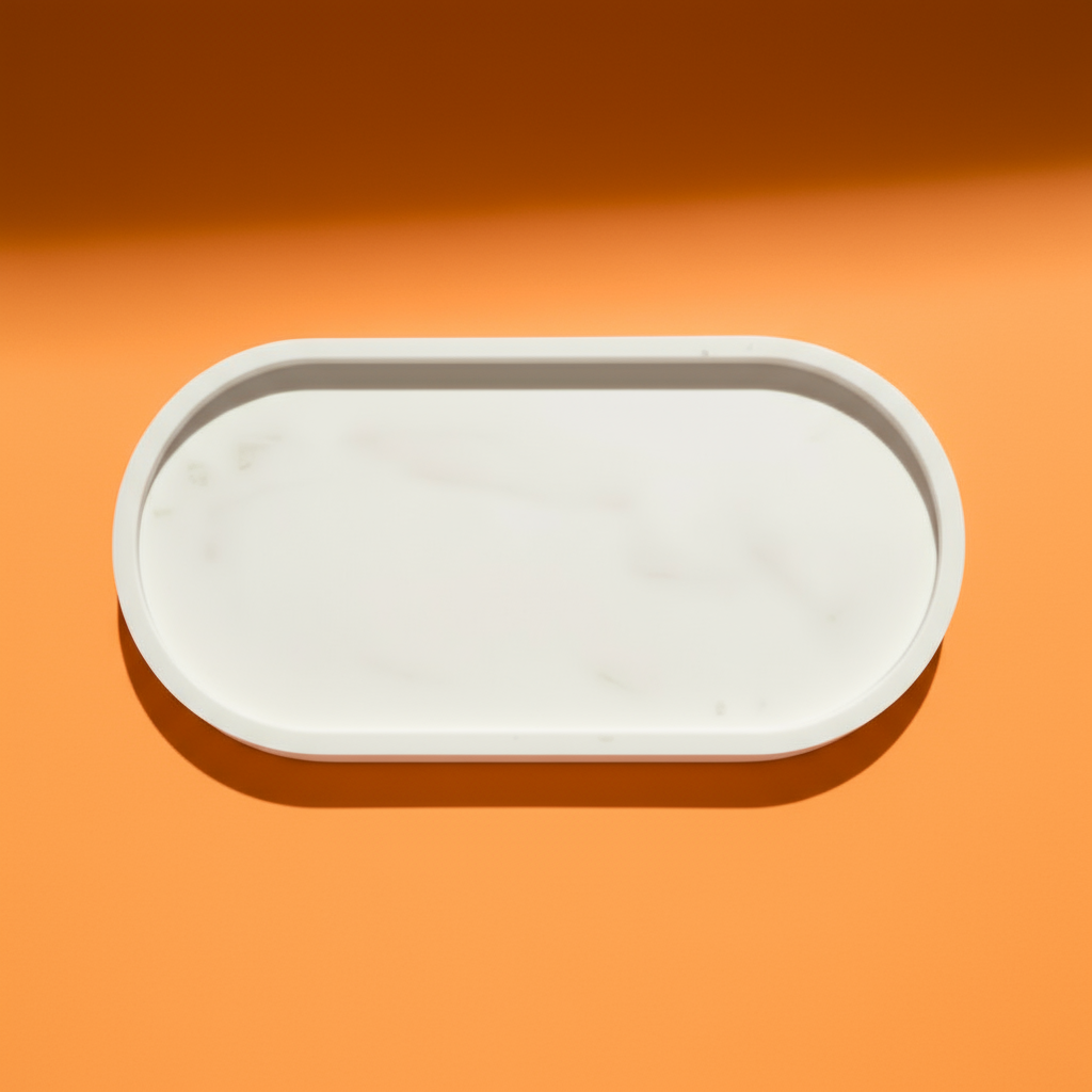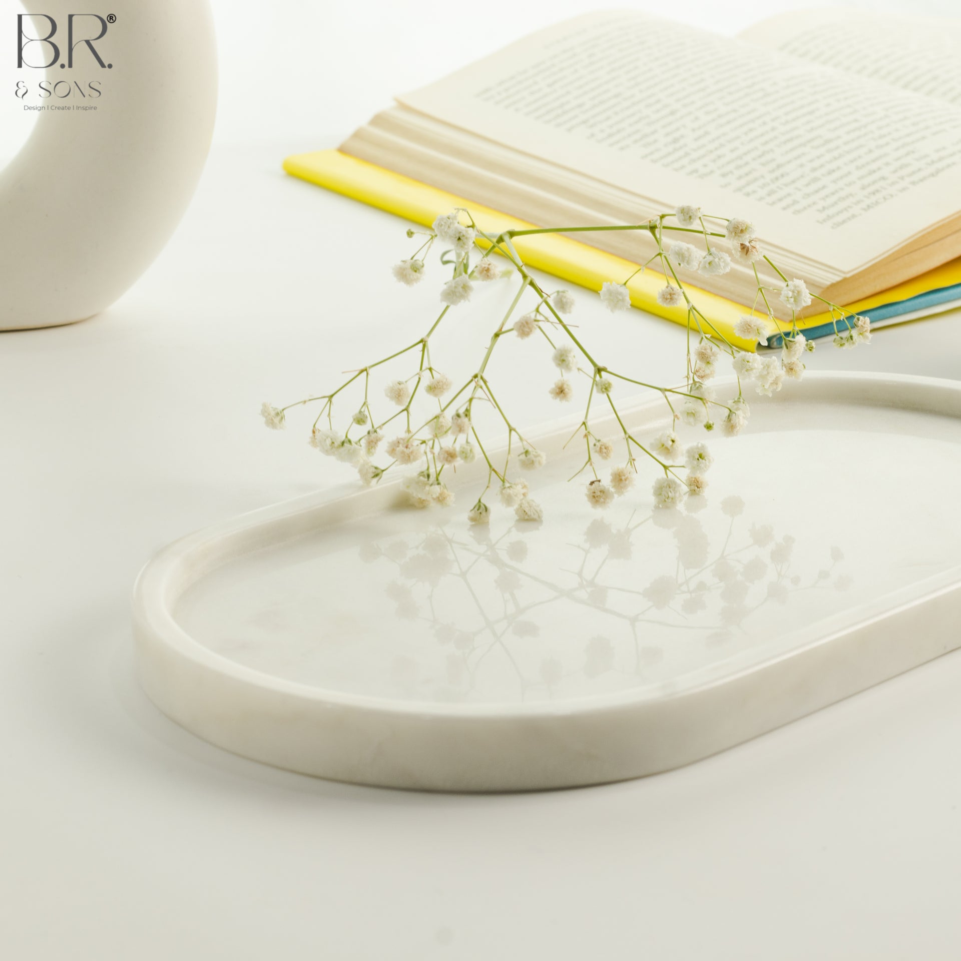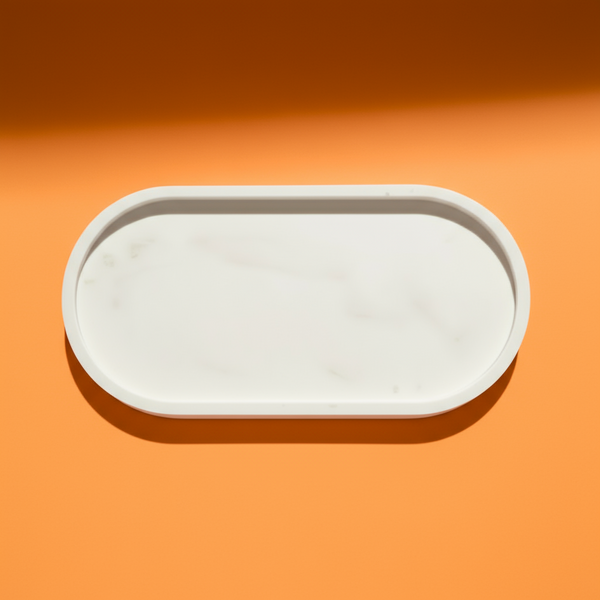 This is our White Oval Marble Tray, made from White Marble. It's perfect if you're looking to add a nice touch to your home. You can use it for decorating your room, placing it on a shelf, or even gifting it to someone special. The natural White Marble gives it a rich and classy look. It's useful, beautiful, and made with care.
