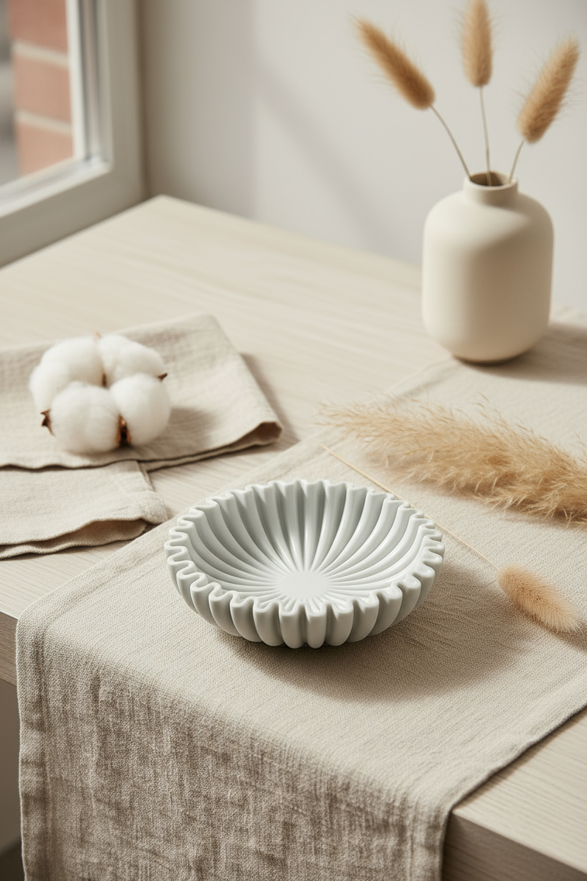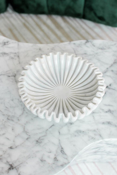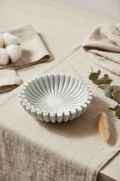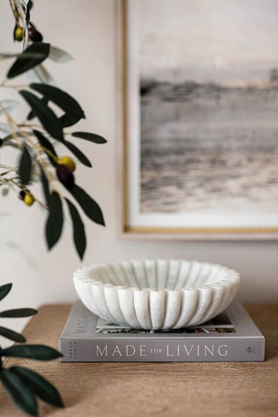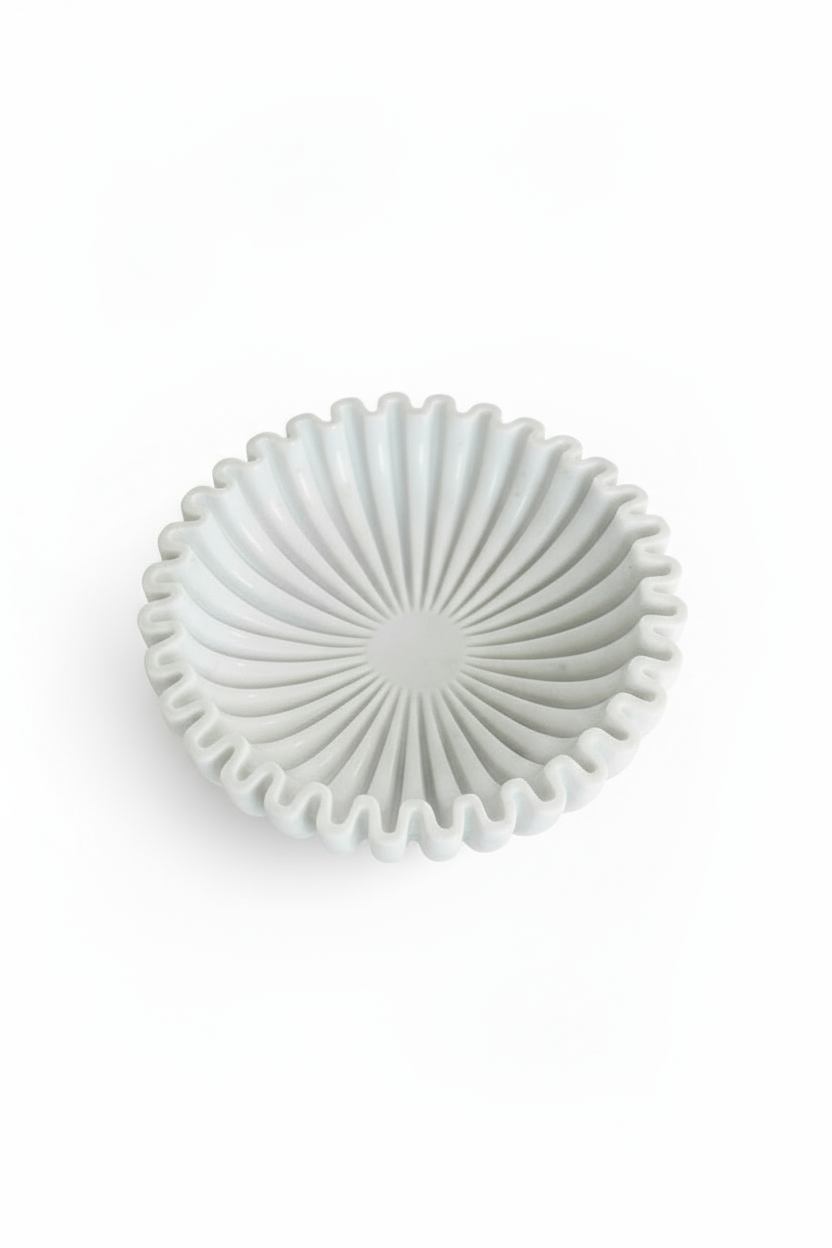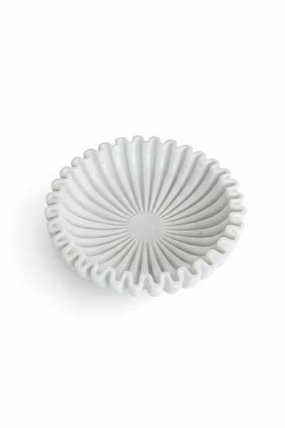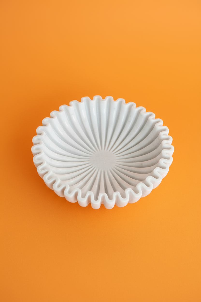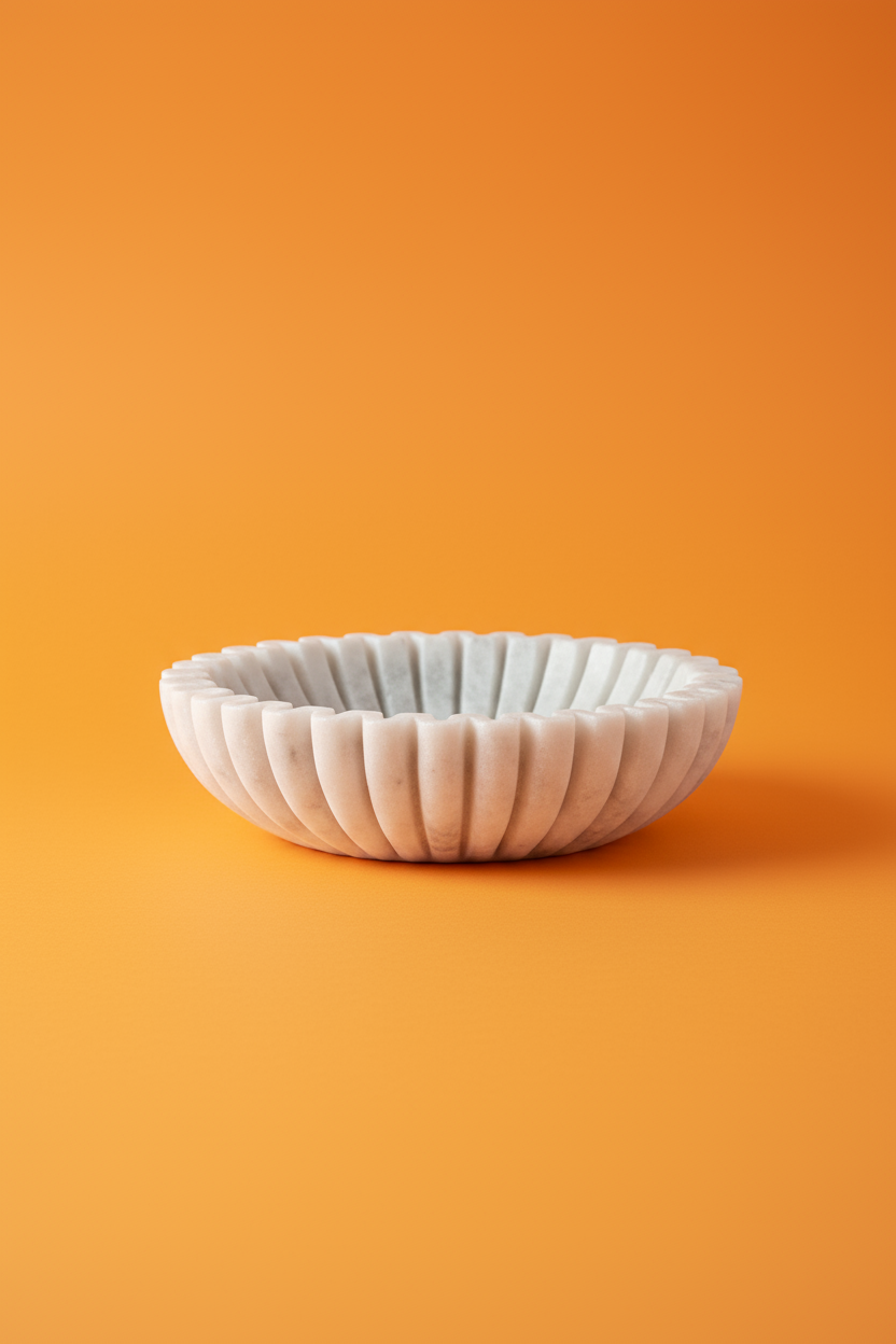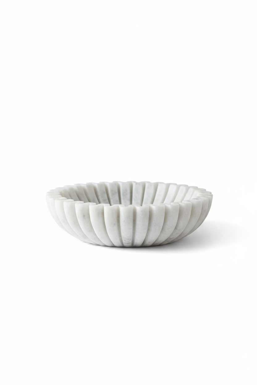 This is our Fluted Bowl Large, made from White Marble. It's perfect if you're looking to add a nice touch to your home. You can use it for decorating your room, placing it on a shelf, or even gifting it to someone special. The natural White Marble gives it a rich and classy look. It's useful, beautiful, and made with care.