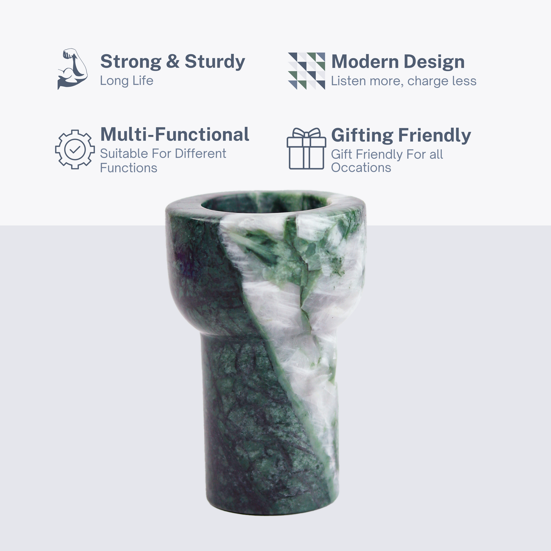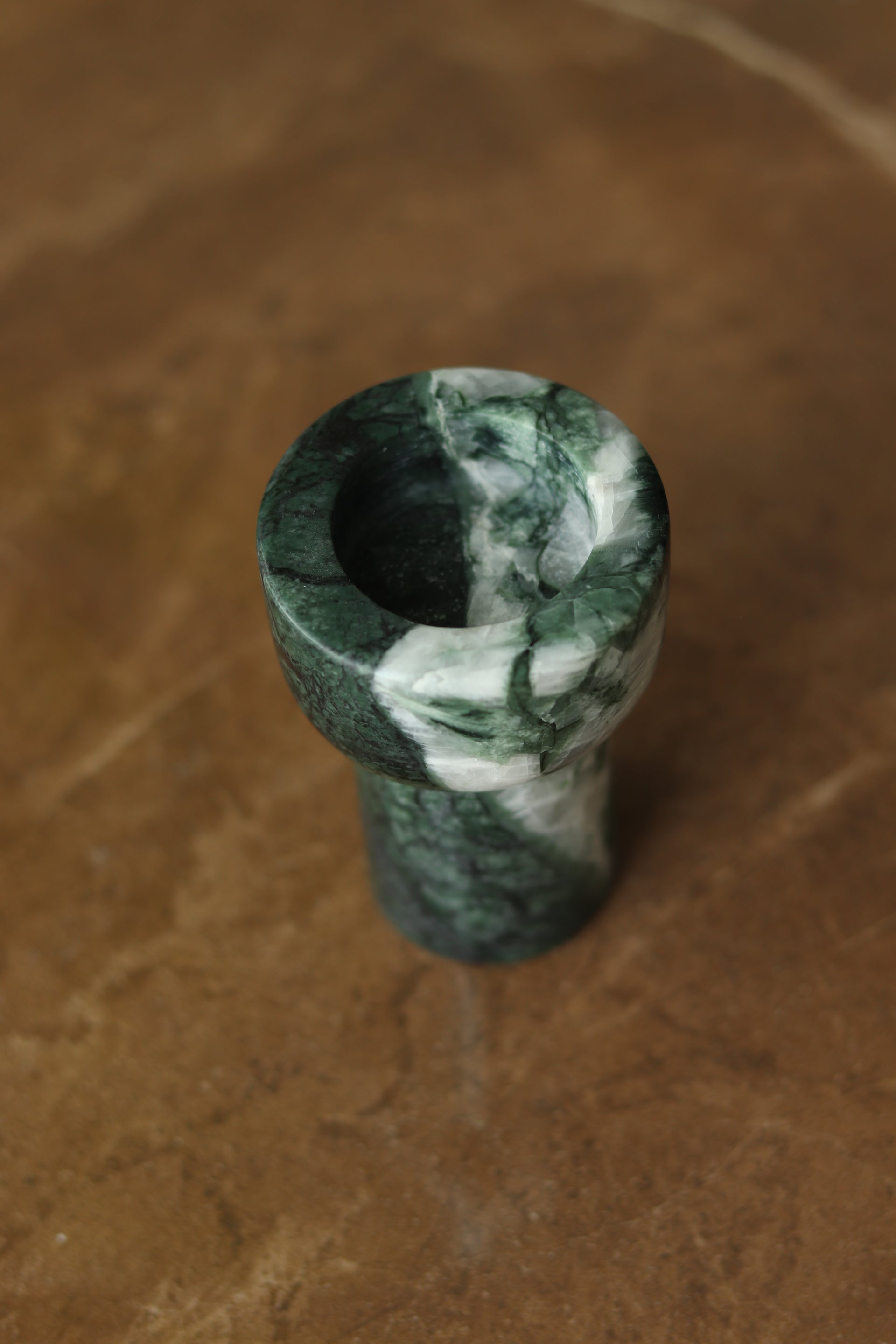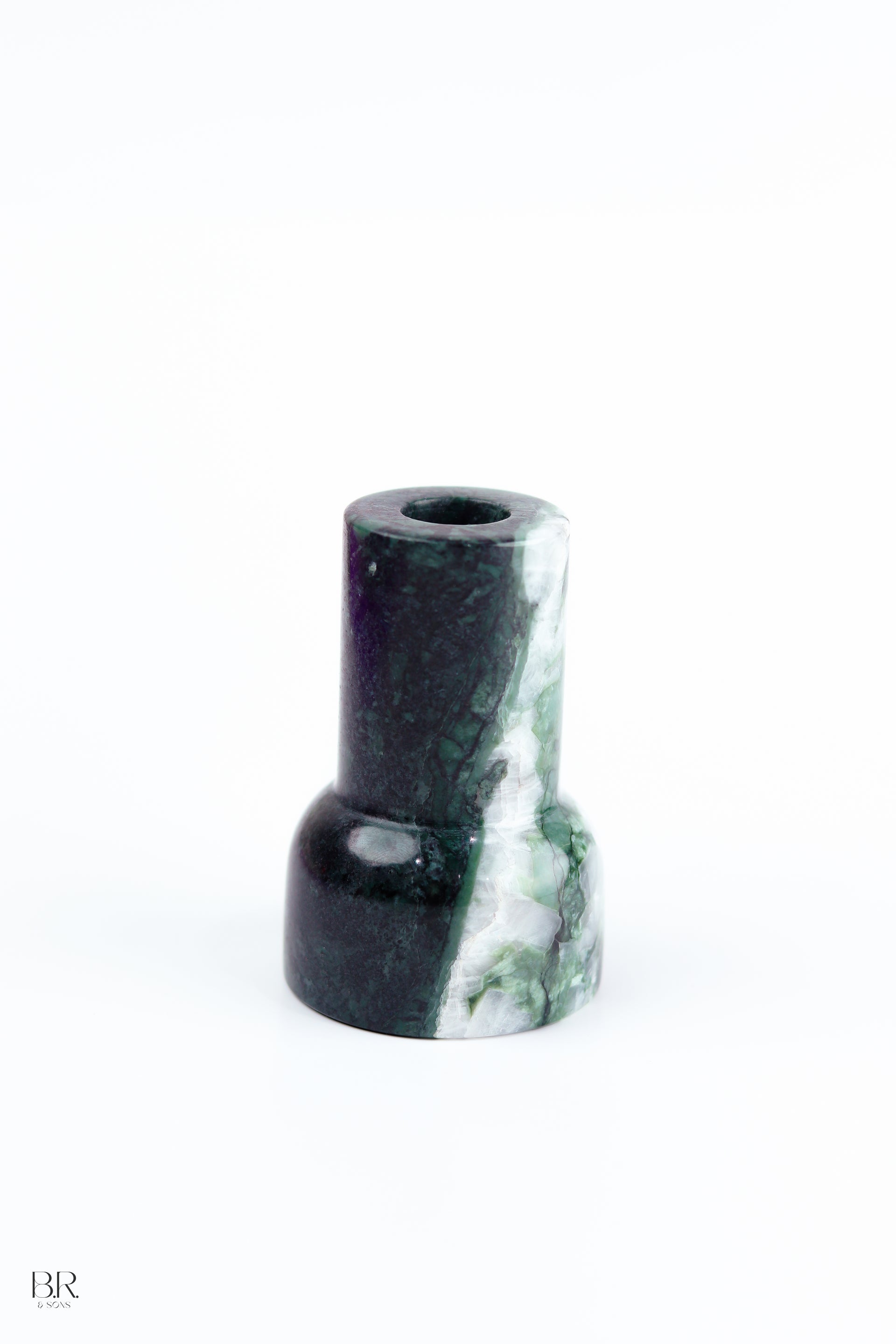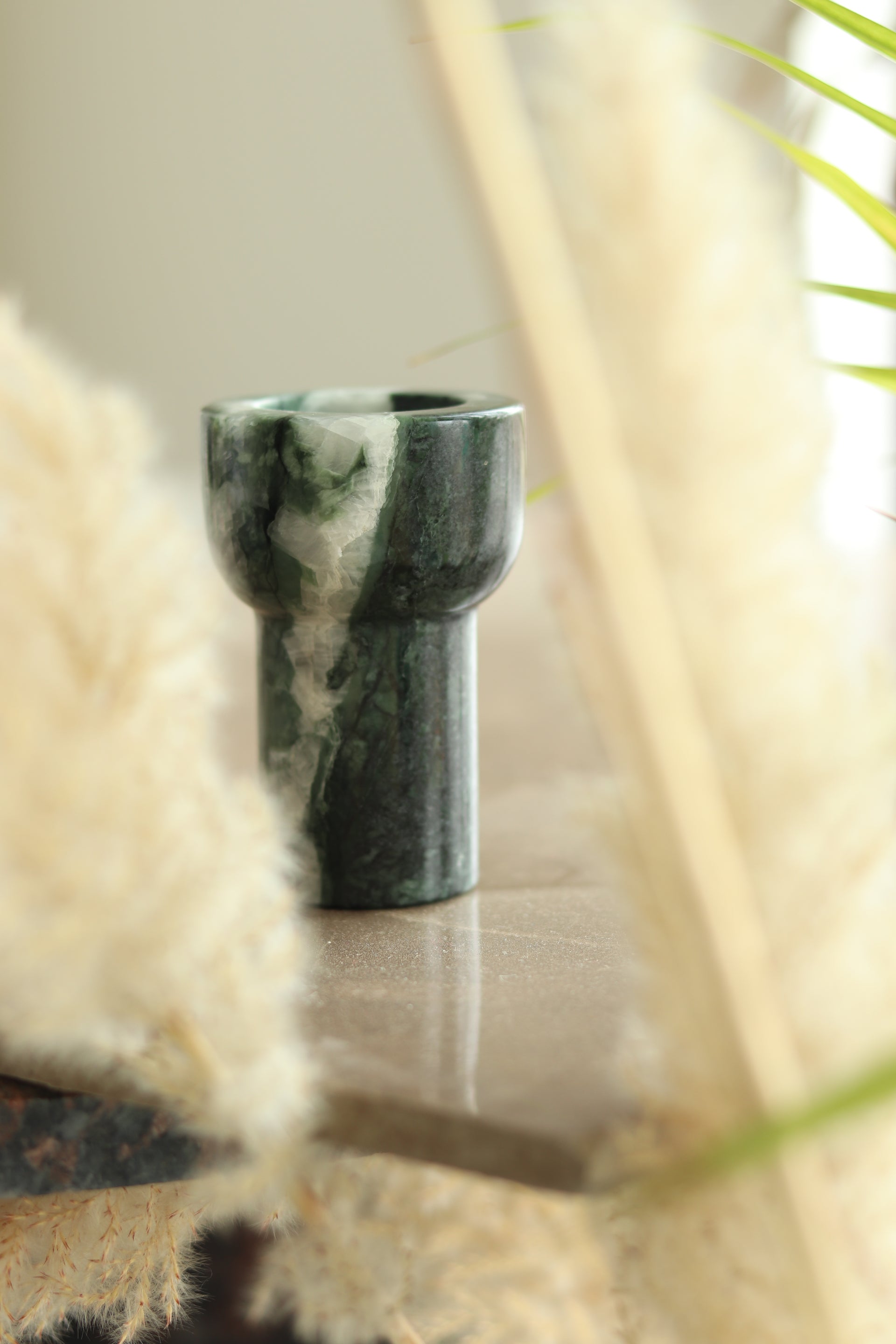 This is our GREEN MASHAAL CANDLE HOLDER, made from GREEN MARBLE. It's perfect if you're looking to add a nice touch to your home. You can use it for decorating your room, placing it on a shelf, or even gifting it to someone special. The natural GREEN MARBLE gives it a rich and classy look. It's useful, beautiful, and made with care.