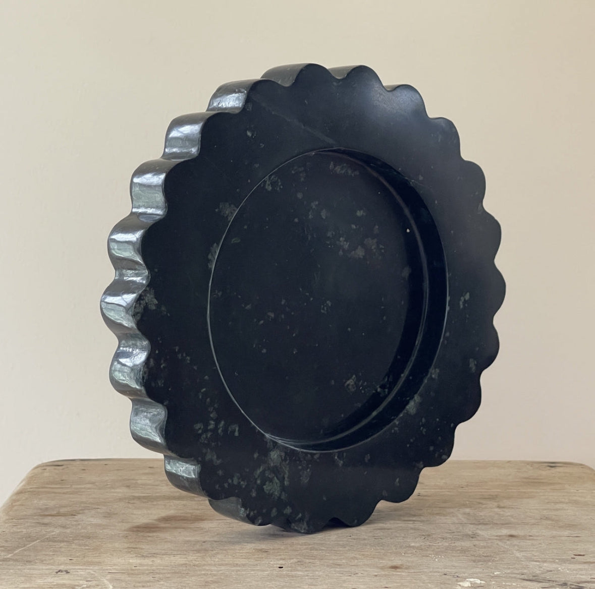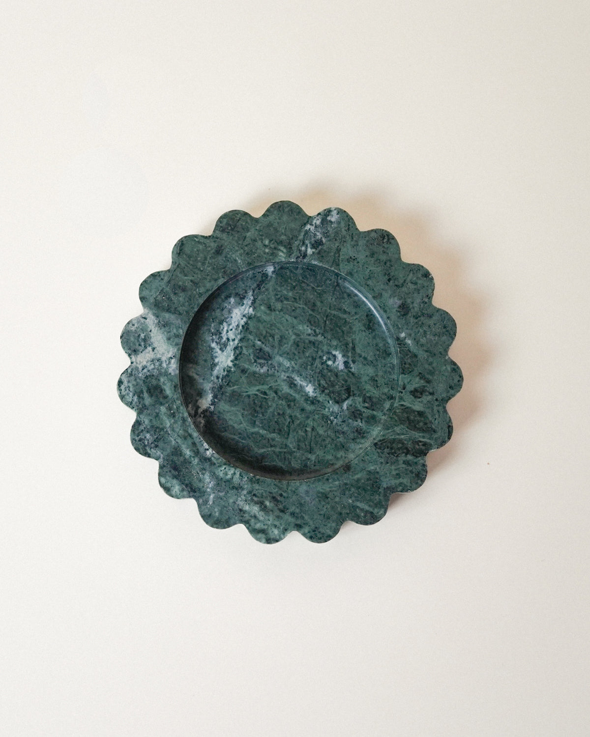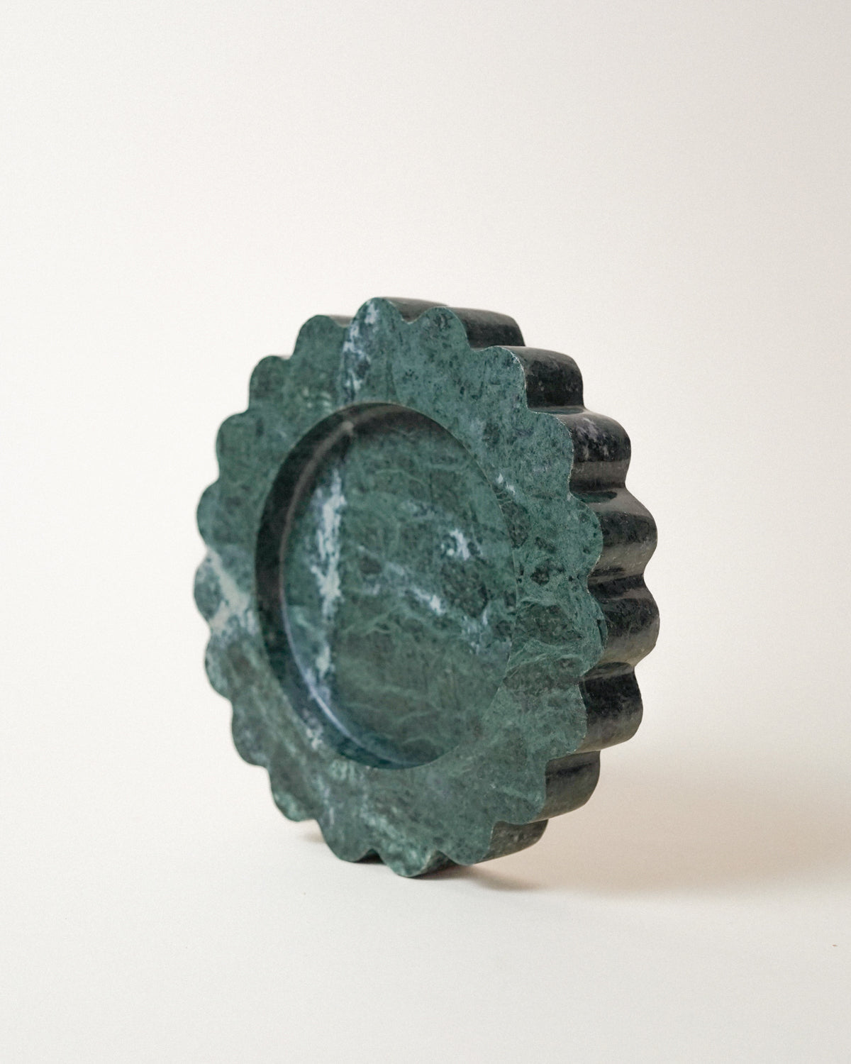 The Floral Tray in Emerald Green is a stunning fine art piece by BR & Sons, expertly hand-sculpted in Rajasthan, India. Crafted from premium untouched green marble stone, this elegant tray is meticulously hand polished to achieve a luxurious finish. Featuring smooth, scalloped edges, this small catch-all tray adds an elevated organic touch to any tabletop or tablescape. Each tray is unique, with variations in color, polish, and pattern that reflect the natural beauty of the stone, ensuring that no two pieces are the same.