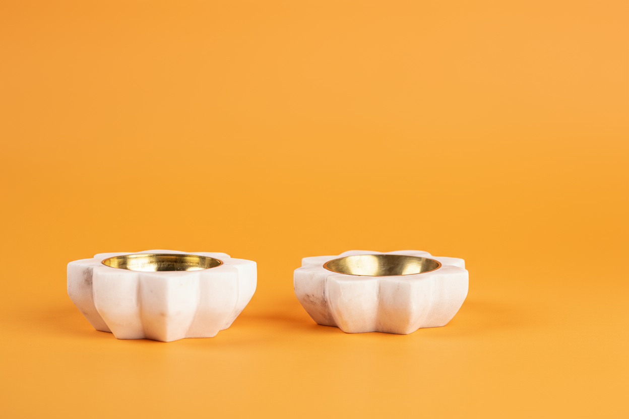 This is our Sunflower Marble Brass Diya, made from White Marble, Original Brass. It's perfect if you're looking to add a nice touch to your home. You can use it for decorating your room, placing it on a shelf, or even gifting it to someone special. The natural White Marble, Original Brass gives it a rich and classy look. It's useful, beautiful, and made with care.