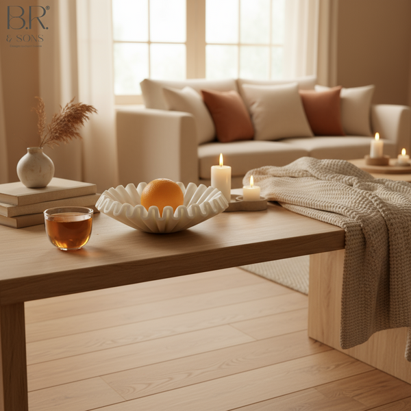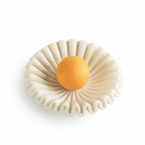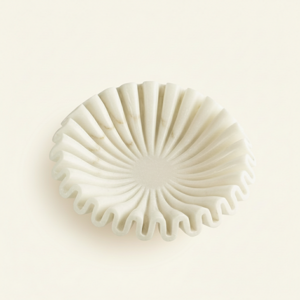 This is our White Marble Falten Bowl, made from White Marble. It's perfect if you're looking to add a nice touch to your home. You can use it for decorating your room, placing it on a shelf, or even gifting it to someone special. The natural White Marble gives it a rich and classy look. It's useful, beautiful, and made with care.