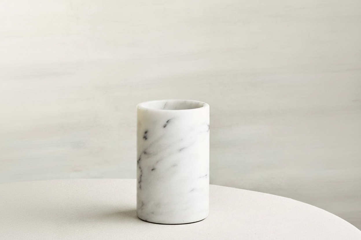 A refined statement for the modern entertainer, our White Marble Wine Holder brings elegance and functionality to your table or bar. Handcrafted in India from premium white marble, its sleek cylindrical form and natural veining make it a timeless addition to any space.